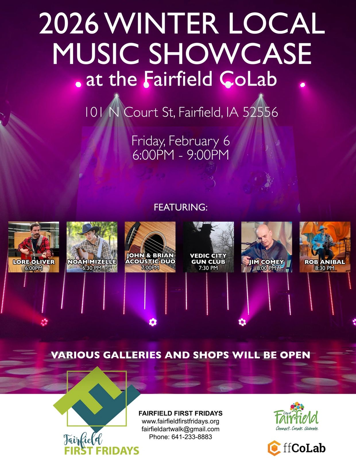 Fairfield CoLab- 101 N. Court St. (Old Iowa State Bank on the square)- Winter Local Talent Showcase. Performances from 6-9 pm